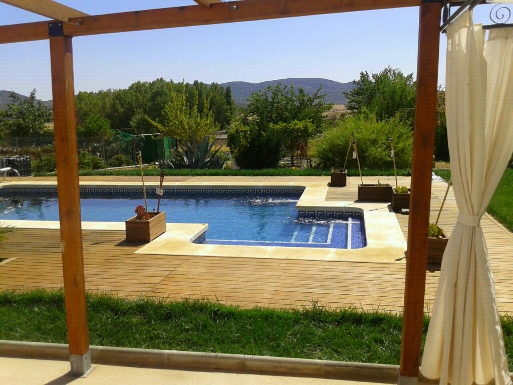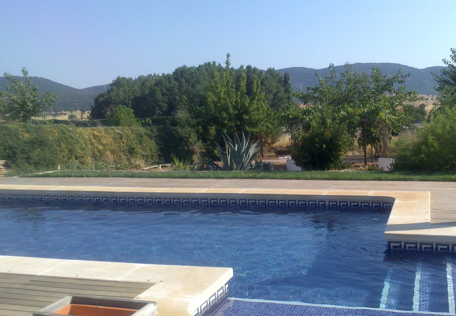 Piscina de 8×4 metros con borde de madera de iroco, perfecta para relajarte bajo el sol. Césped natural de 70m² y espacio ajardinado para disfrutar del aire libre.